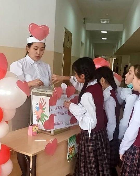 мектеп-гимназиясында денсаулық айлығына байланысты мектеп психологтары А. Искакова мен Ф. Жүнісбекова "Жүректен-жүрекке" атты акция өткізді. Акцияның мақсаты ең мейірімді ұстазбен, ең мейірімді оқушыны анықтау және мейірімділікке баулу. Оқушылар акцияға белсене қатысты.
