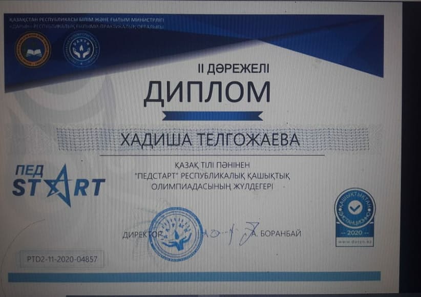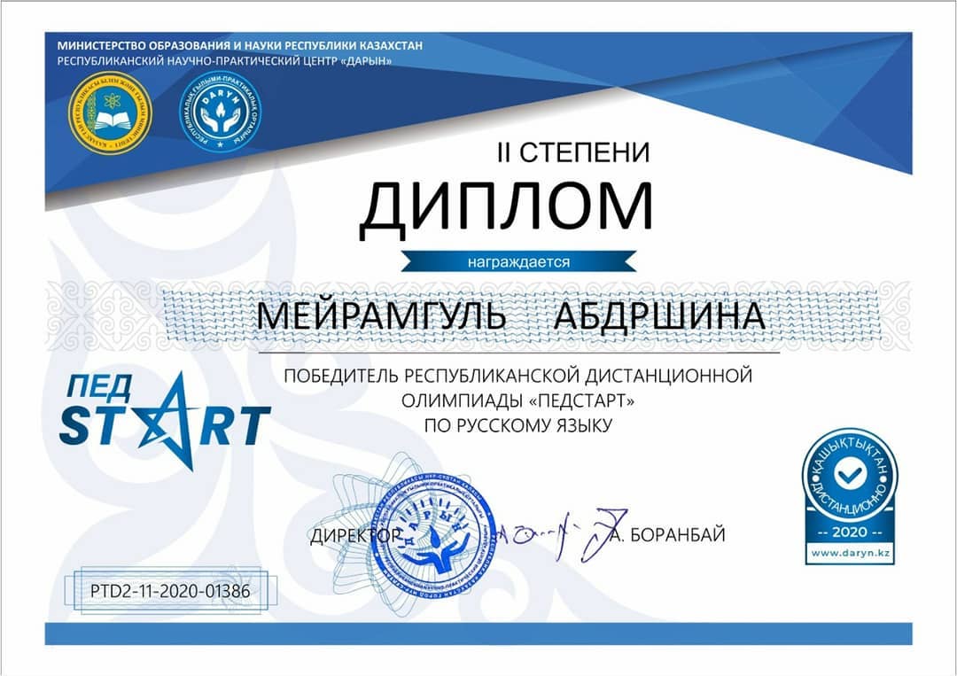 14 ноябрь 2020 0 1 2 3 4 5 Дарын" республикалық ғылыми- практикалық орталығының ұйымдастыруымен өткізілген "ПЕДСТАРТ" олимпиадасында ұстаздарымыз жүлделі орын иеленді!