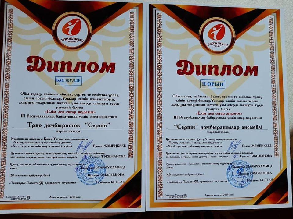 " Елім деп соғар жүрегім" ІІІ Республикалық байқауында мектебіміздің талантты оқушыларынан құралған "Серпін" домбырашылар ансамблі үздік өнер көрсетіп бас жүлдені иеленді !!! Жетекшісі Бесенбина Әсел апайымыз бен оқушыларымызды шын жүректен құттықтаймыз!