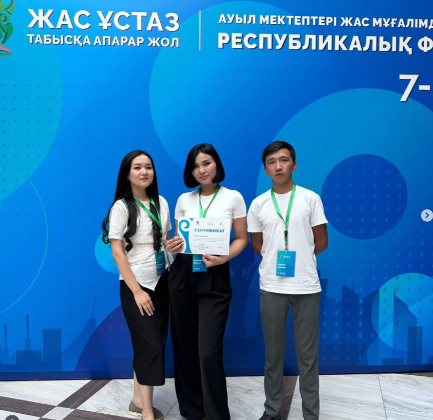 7-8 тамыз күндері Астана қаласында өткен ауыл мектептерінің жас педагогтеріне арналған «Жас ұстаз: табысқа апарар жол» республикалық форумына мектебіміздің жас мамандары биология пәні мұғалімі - Құрбан Сұңқар, бастауыш сынып мұғалімі- Жұмашқызы Мейіргүл, химия пәні мұғалімі-Кенішбекова Айғаным қатысып, іс-тәжірибелерімен бөлісті.
